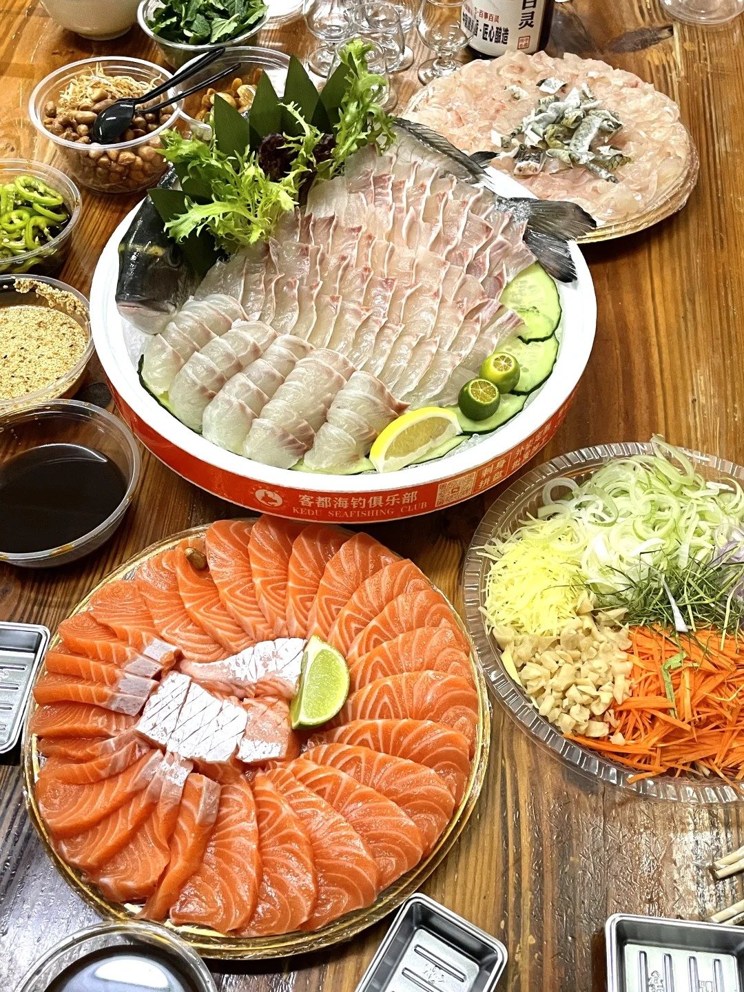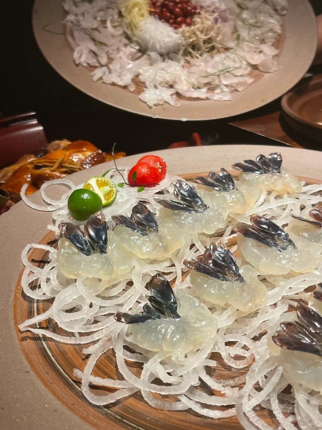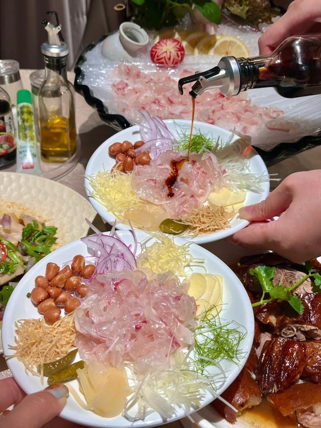 Guangzhou fish sashimi features fresh ingredients, delicate slicing, thin slices, paired with various condiments, offering a smooth and sweet taste, embodying the Cantonese aesthetics of freshness.