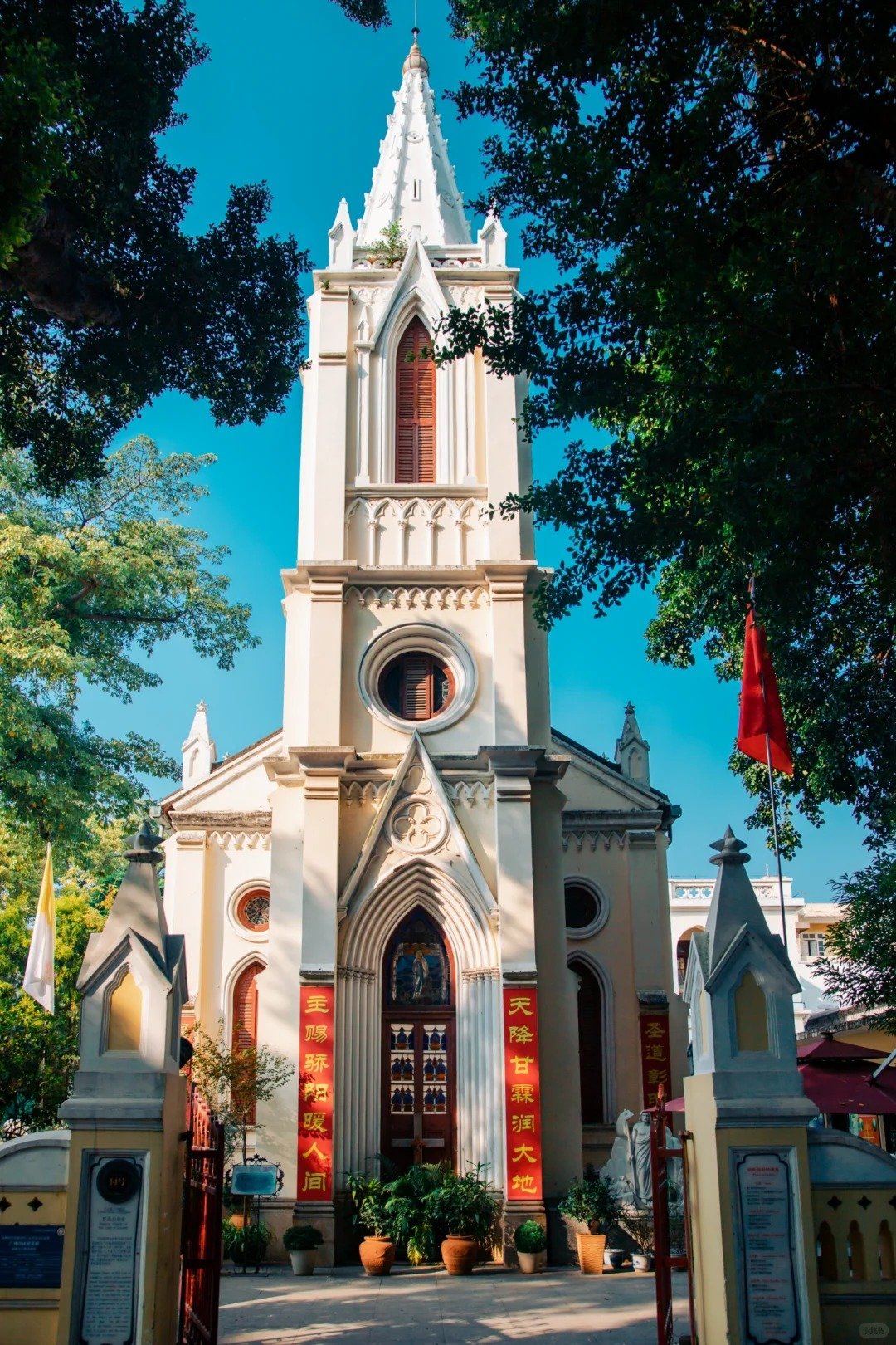 The Church of Our Lady of Lourdes in Shahe was built in 1889, located in the French concession of Guangzhou during late Qing Dynasty and the early Republic of China. The church worships Our Lady of Lourdes as its patron saint. The entrance is Gothic-style. It named after a Mary Mountain built in the garden of the church, where a statue of Our Lady of Lourdes was placed. Our Lady of Lourdes is depicted in white a blue ribbon. The church has witnessed colonial history and the changes of the world.